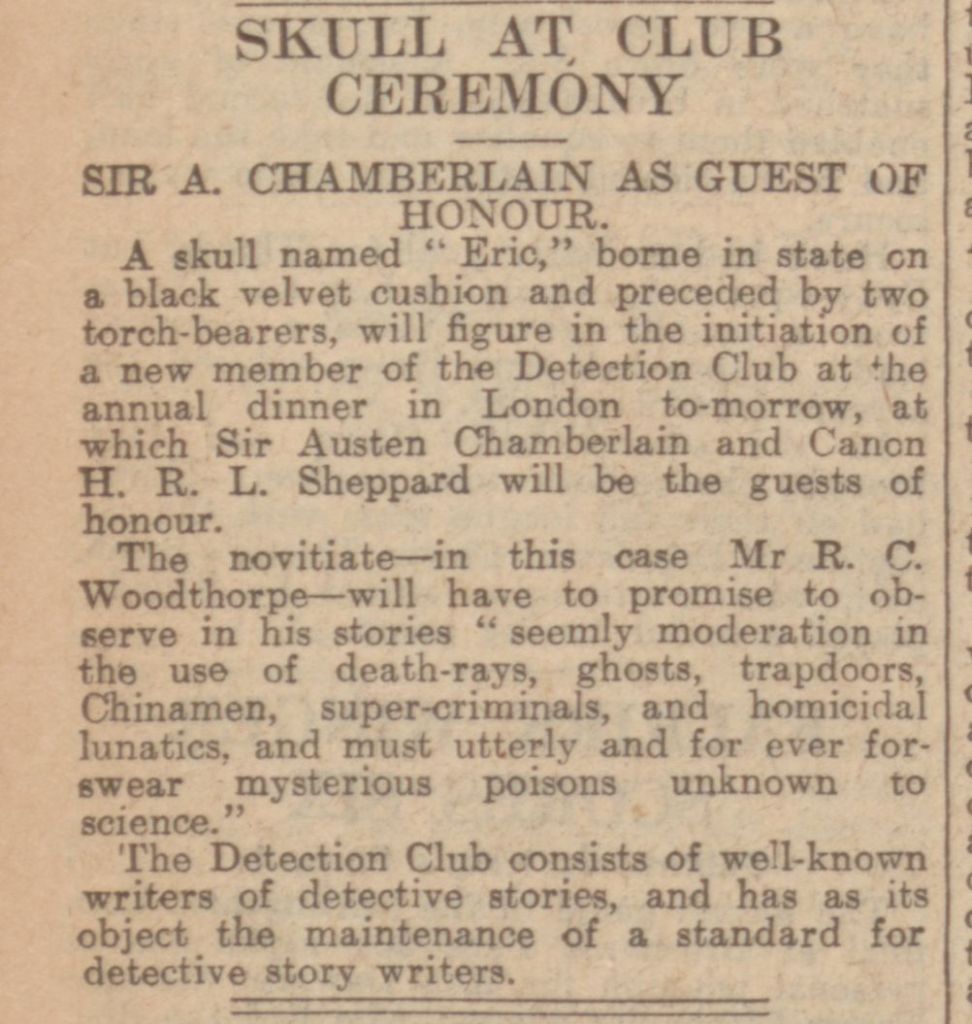 The format of Agatha’s fictional ‘Tuesday Night Club’ in which a group of amateur detectives meet to discuss crime, mirrors Agatha’s own membership of The Detection Club, which formed in 1930. Started by fellow crime writers Anthony Berkeley (author of The Poisoned Chocolates Case), and Dorothy L Sayers (creator of Lord Peter Wimsey), the group met at their headquarters on Gerrard Street in London’s Soho district, to discuss criminology, police procedure, and true-crime cases, over dinner. The group invited other worthy crime writers to join them and were known to require new members to swear a tongue-in-cheek oath on the skull of Eric, the club mascot, to follow certain rules of crime writing. These ‘rules’ followed the idea of fair play, in which readers had to be given all the necessary clues to identify ‘whodunnit’. It expressed a formulaic list of ingredients needed for the perfect work of detective fiction.